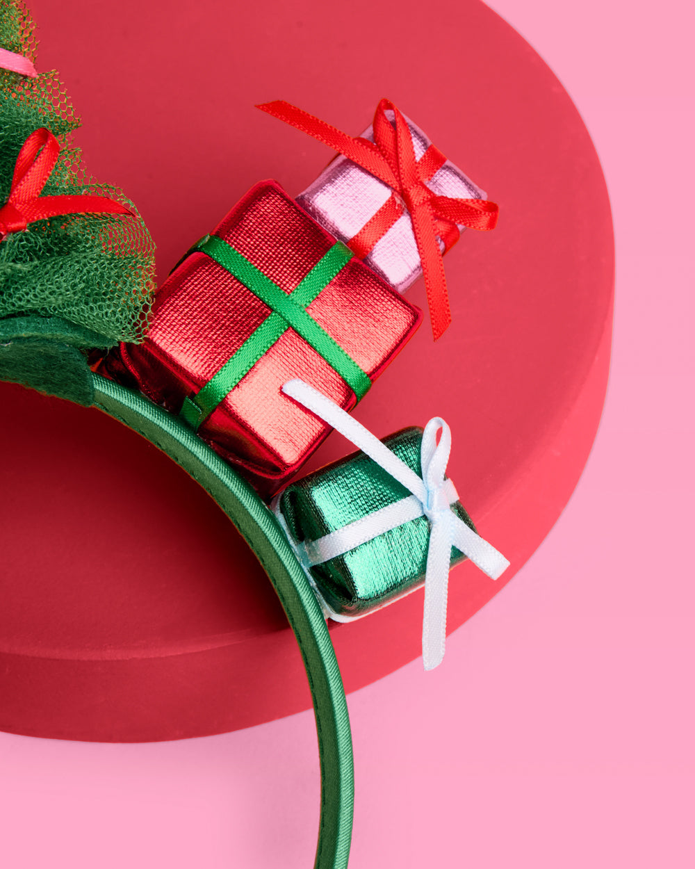 - Green tulle Christmas tree with pink and red satin bows