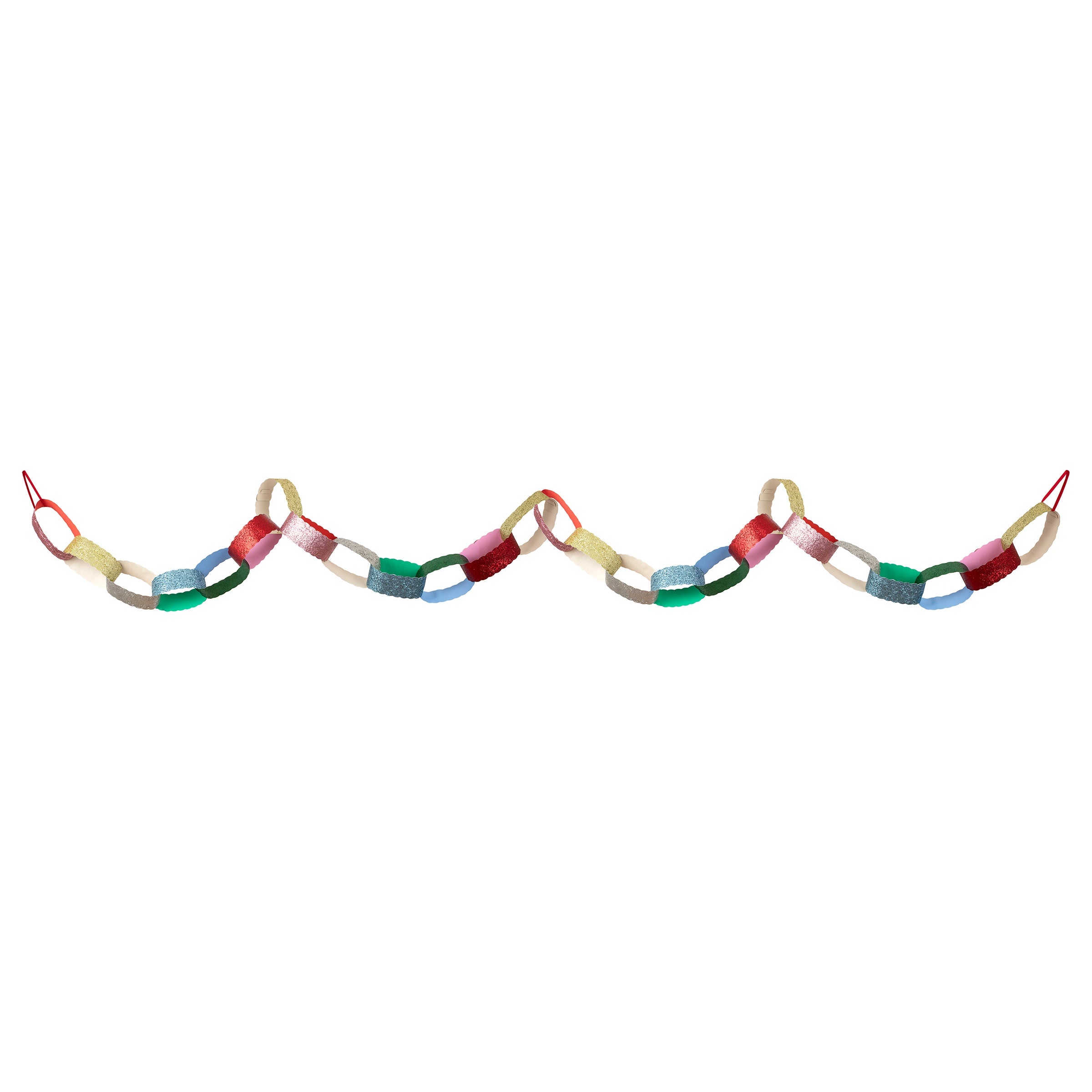 Paper chains are back in style! The whole family will love linking these oversized chains together. With scalloped edges, chunky glitter on one side, a complementary color on the inside and a red velvet hanging ribbon, they create a playful yet chic vibe. Perfect for your porch, doorway, wall, mantel, window or draped over your party table. When the celebrations are over, simply pack them away and reuse them year after year.