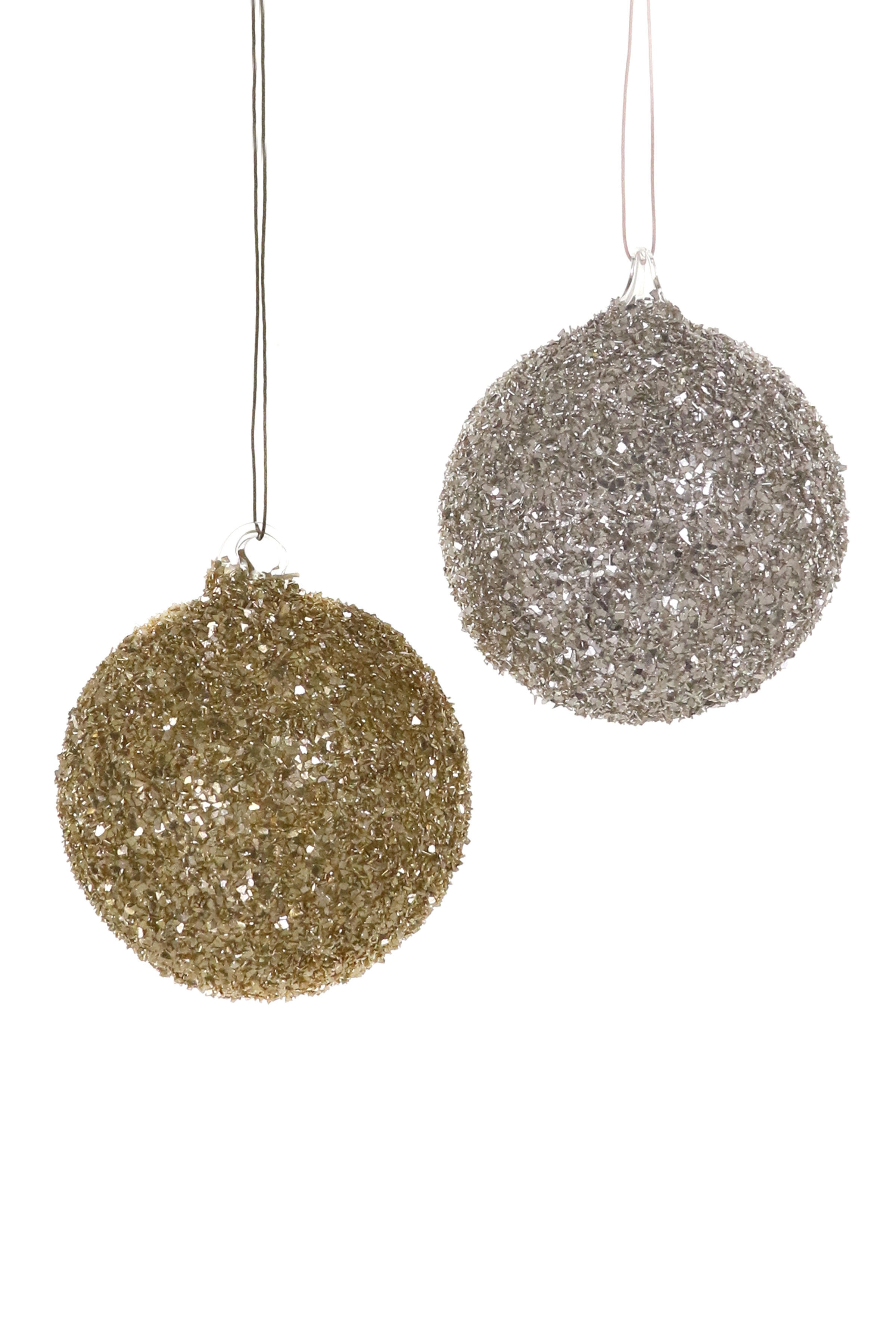 Made from glass and encrusted with glitter, these baubles shimmer with timeless elegance.
