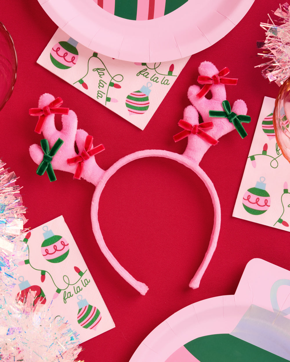 - Stuffed reindeer antlers w. red + green bows