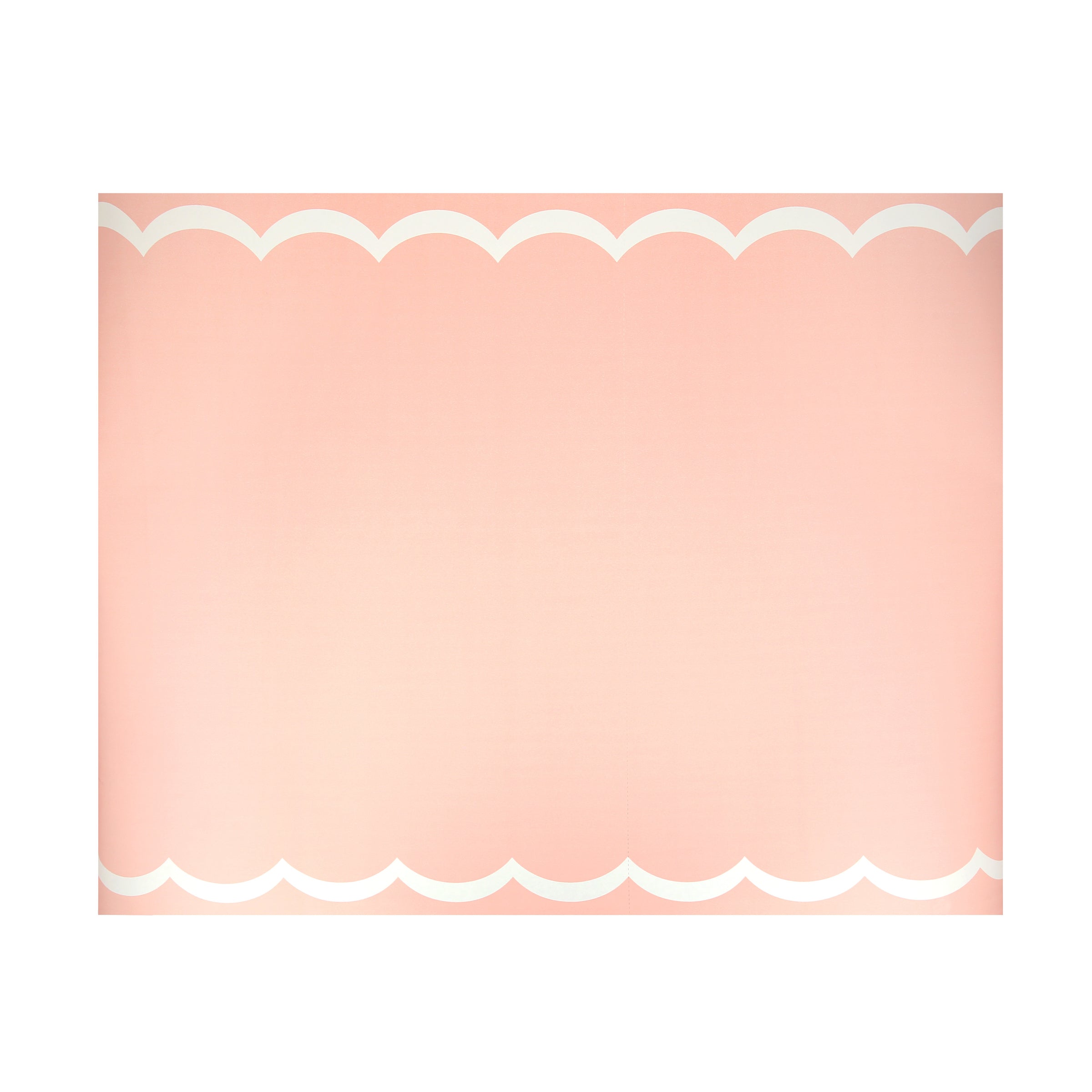 Our paper table runner is the ultimate multi-tasker for modern entertaining. Perfect for layering, it adds a pop of color to your celebration, and also helps protect your table or tablecloth. Beyond the dining table, drape it over buffet tables, coffee tables, or sideboards, for an extra dose of sophistication and style. The soft shade of pink, with a white scalloped edge, is ideal for birthday parties, baby showers, princess parties, fairy parties and unicorn parties.