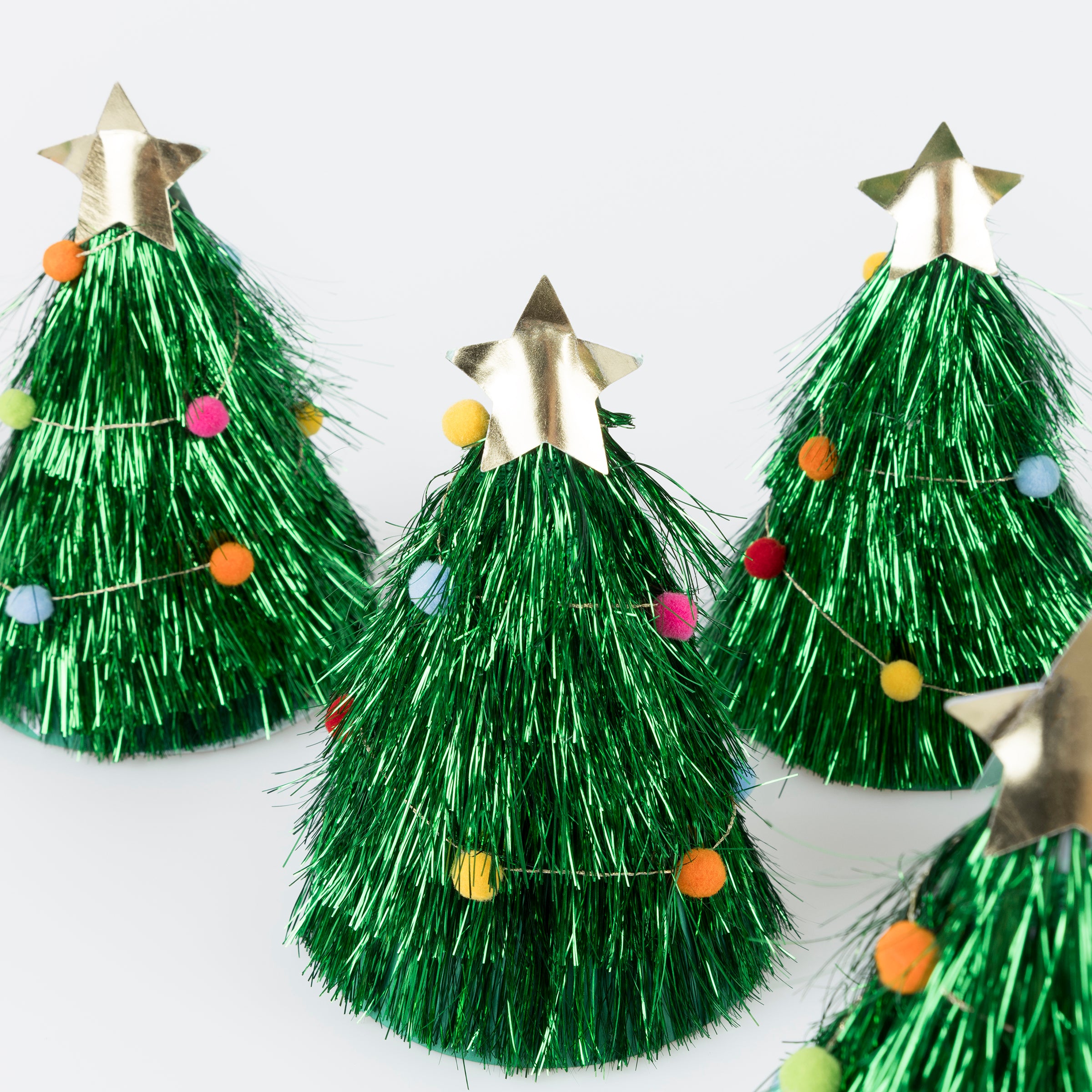A tree on your head? It must be Christmas, where the merrier the hair accessory, the better! These jolly paper party hats, designed to look like pompom-adorned Christmas trees, complete with green tinsel and gold foil stars, are ideal for a fun, festive look the whole family (ages 3+) can enjoy. Great for Insta-perfect moments!